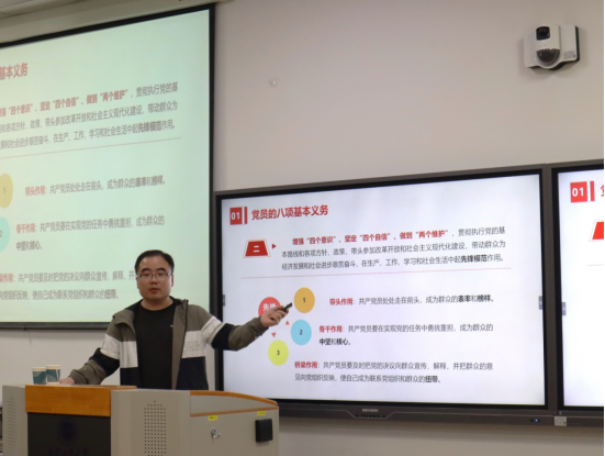 董元浩以“义务与权利,心中要牢记”为题,为学员们系统阐释了党员的基本义务、基本权利以及义务与权利之间的关系。通过文字、图片以及视频的方式图文并茂的为学员们进行了讲述。同时特别强调了党员应如何更好的履行义务和行使权利,党员应通过加强学习、实践全心全意为人民服务的宗旨、增强组织纪律观念来正确履行义务和行使权利。