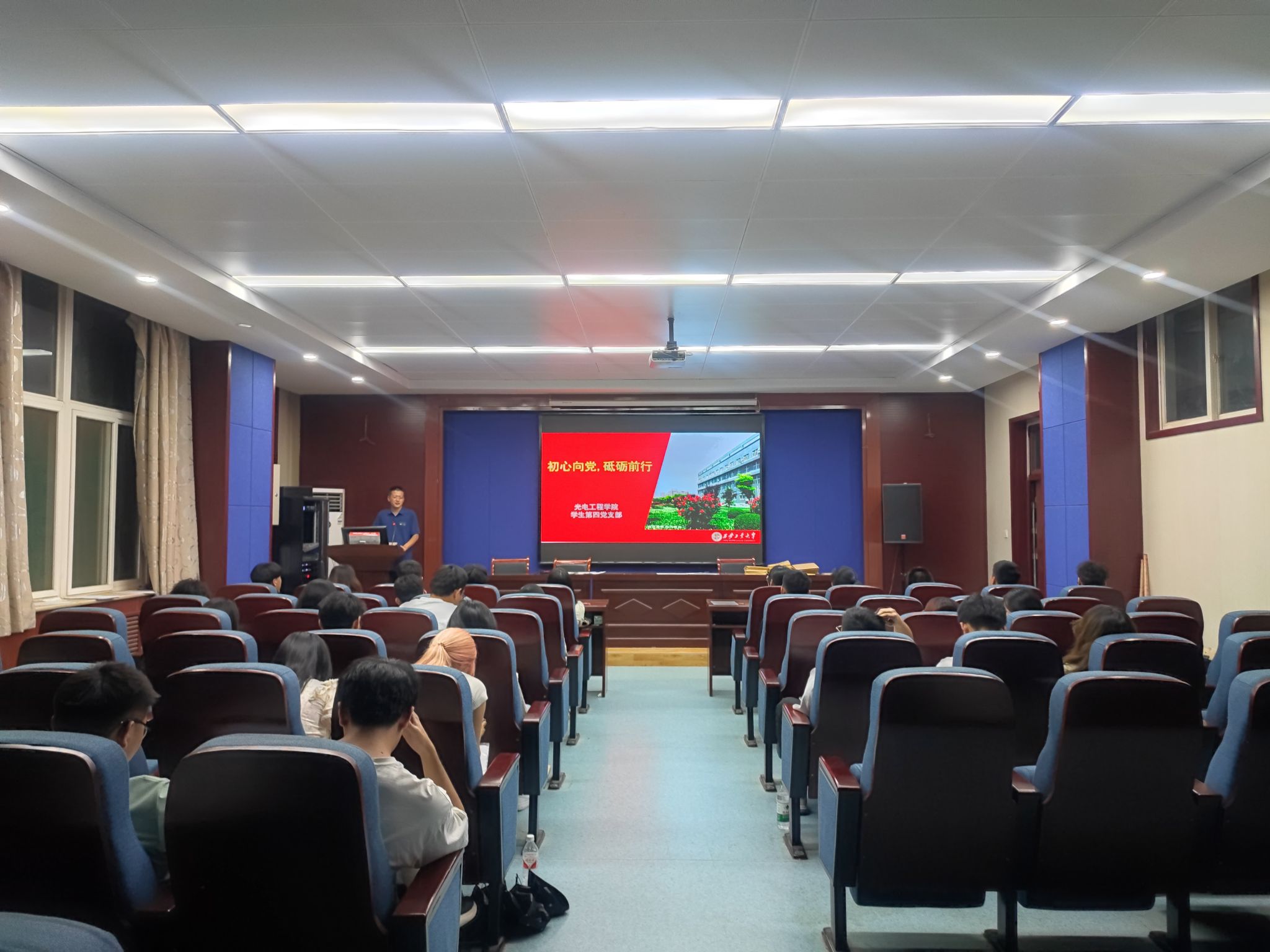 学生第四党支部书记乔海东老师在工6-402为全体党员开展了以“初心向党 砥砺前行”为题的党纪学习教育党课。