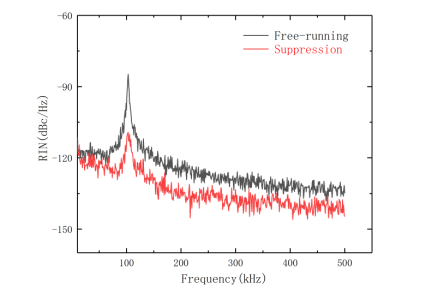 窄线宽单频光纤激光器的典型RIN测试结果(抑制前后)
