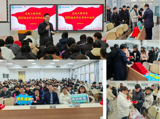 于12月4日在教2-106举办了2025届本科生考研加油会。学院党委书记周顺、副书记杨利红、学生工作办公室主任刘强珺、毕业班辅导员蒋紫洮、郭帅以及全体2025届考研学子共同参与了此次活动,会议由蒋紫洮主持。