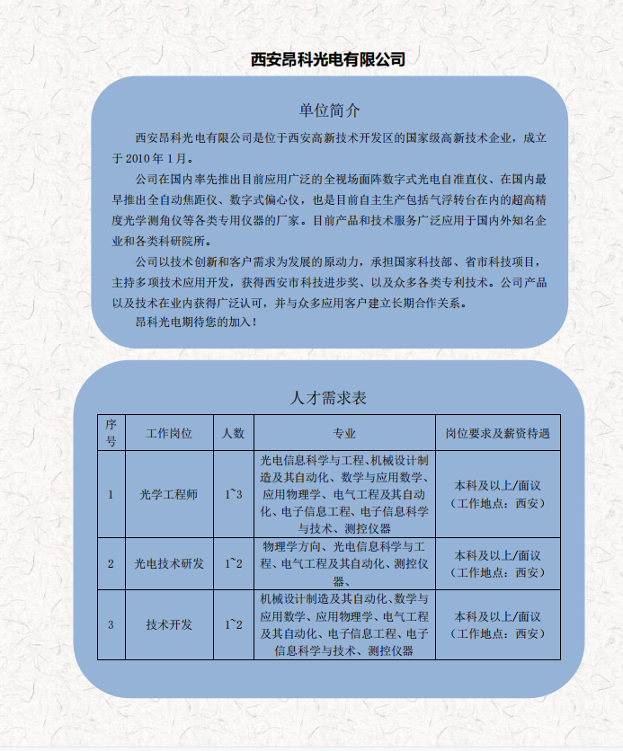 西安昂科光电有限公司招聘
