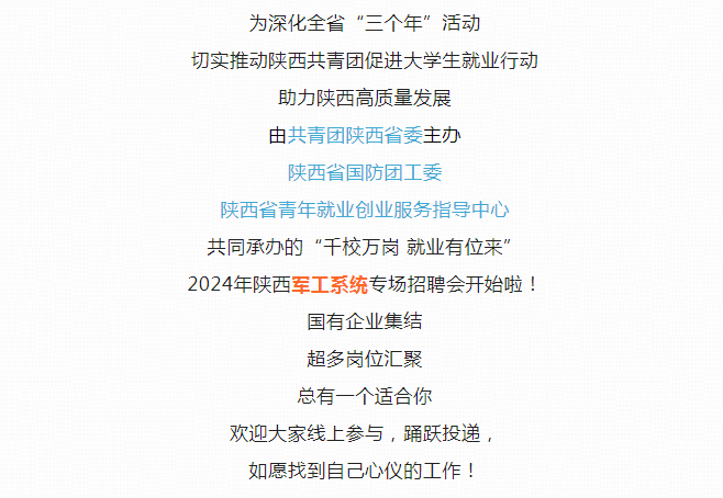 招聘会讯 | 2024“千校万岗·就业有位来” 【第3场】— 陕西军工系统专场招聘会来啦!