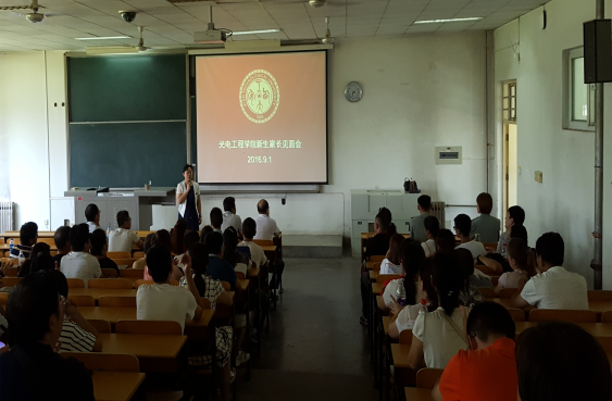 高明院长、院党委书记弥谦、院党委副书记陈彤及2016级辅导员兰珺喆、朱先彬及100余名新生及家长共同参加了见面会。陈彤副书记主持见面会。院长高明首先代表光电学院欢迎2016级新生的加入,同时将学院的基本情况、学科建设、人才培养等方面用PPT进行了较为详细的介绍。院党委书记弥谦就学生的大学适应性、学籍管理、校纪校规、就业情况等方面对到会的新生与家长做了详细说明,希望16级同学遵守校纪校规,努力学习,珍惜大学时光,为自己将来的就业打下坚实的基础,拓宽就业渠道,勇敢逐梦,实现理想。院党委副书记陈彤希望新生们要尽快从中学的应试学习模式转变到大学自主学习模式,尽快融入大学的学习生活,给自己设立新的奋斗目标。家长们也要经常和孩子沟通,经常关心孩子的学习生活情况,主动和辅导员、班主任联系,了解孩子在校的情况,陈副书记祝愿16级的同学都能平安顺利的毕业。陈副书记还将今年暑期在广东走访毕业生调研的情况与现场的家长及新生进行了分享,希望16级同学在将来就业的时能够突破地域的限制,到沿海发达地区就业发展。最后,院领导与家长及新生进行了交流,解答他们的疑问。