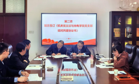 会上,陈燕宣读了《关于机关各党支部与学院党支部开展结对共建的实施意见》。党办校办党支部书记何春水与光电工程学院实验室教工党支部书记梁海锋共同签订了《机关党支部与学院党支部结对共建协议书》。