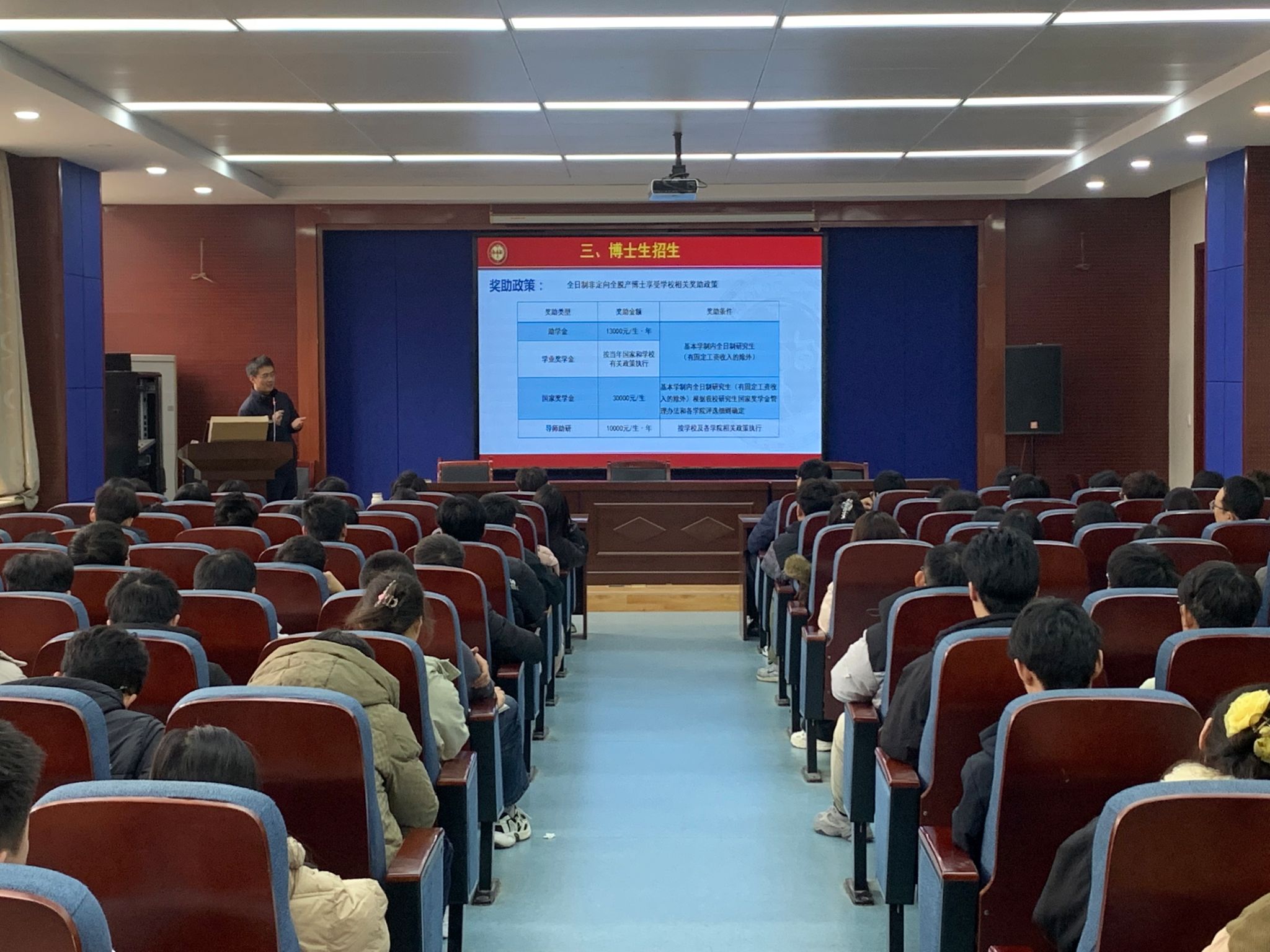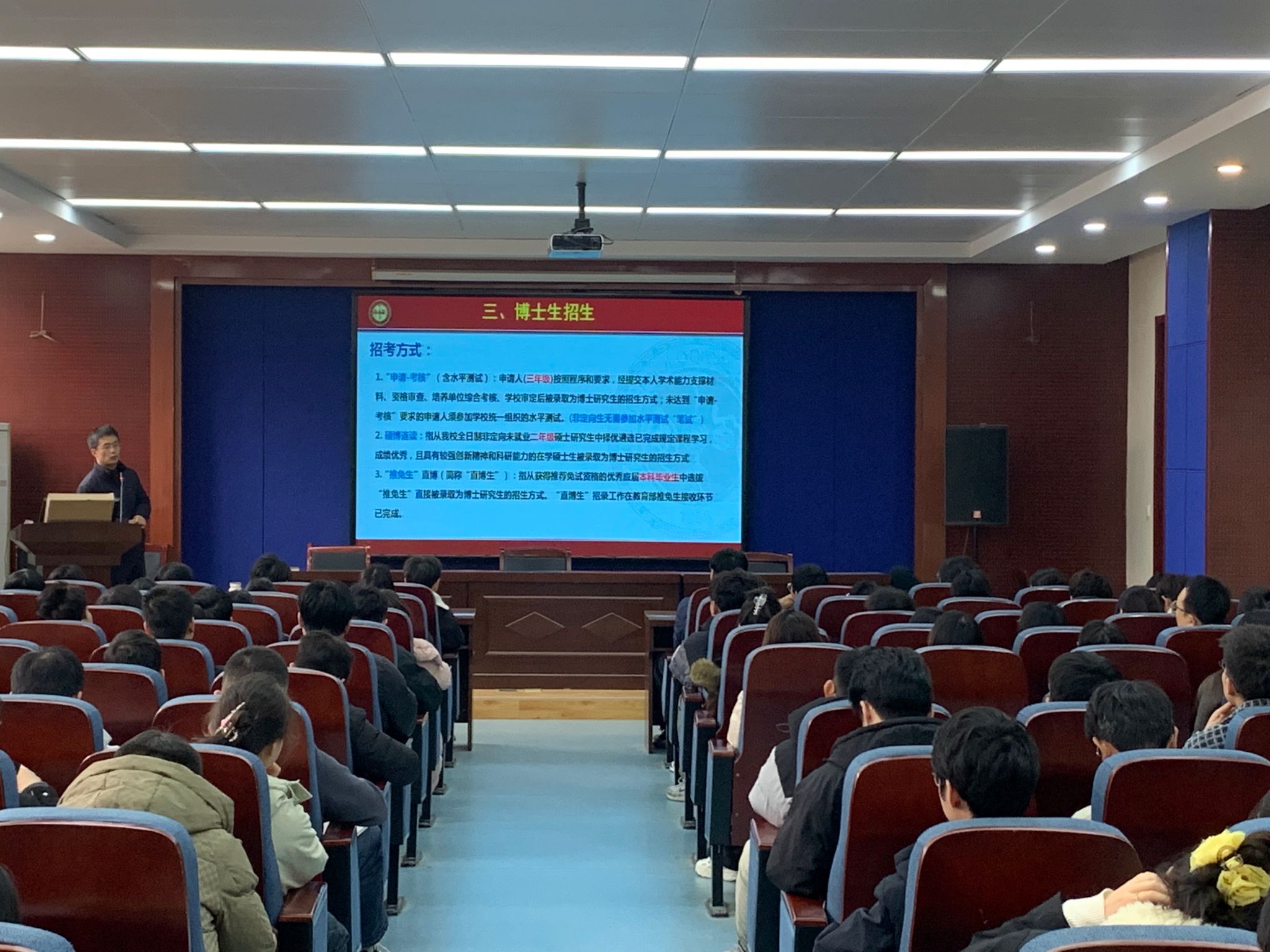 基本情况、博士研究生教育概况(学位点、师资、各类博士研究生招生政策、奖助体系等)和博士研究生教育的优势与特色进行详细介绍,鼓励大家积极同导师、研究生秘书沟通,通过多渠道了解更多信息。田院长的宣讲形式新颖、内容丰富、阐释精准,有很强的指导性和针对性,台下的同学们听得聚精会神,会上不时传来大家的掌声。