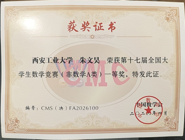 喜报!调教合集 朱文昊同学斩获第十七届全国大学生数学竞赛全国决赛一等奖