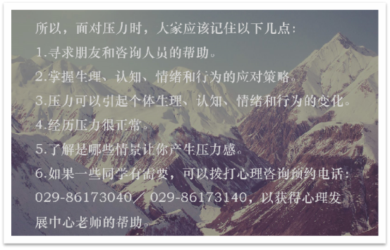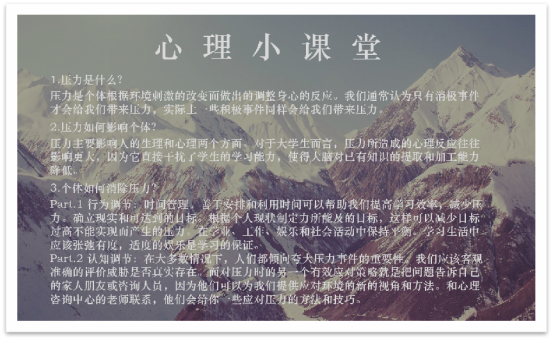 第四项活动,在肯定同学们积极分享有效经验的基础上,普及心理压力的小知识:压力是什么,压力如何影响个体,个体如何消除压力。同学们认真聆听,学到了日常实用的心理知识。