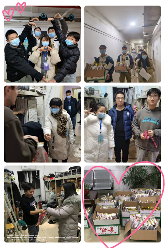下午五点四十分,两位书记、全体辅导员以及学生志愿者带着瓜子、橘子、糖果等礼物逐一敲开同学们的宿舍门,为大家送上跨年的温暖祝福和礼物。希望大家2022年所求皆所愿,所行化坦途。从五点四十到凌晨一点,老师们送完礼物后又为同学们温馨守夜,守护同学们的安全,让同学们热切感受到来自学校和老师们的关心和爱护。