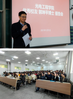 周顺书记对郭坤平博士的求学经历以及相关研究成果介绍后,本次报告会正式拉开帷幕。郭坤平博士从教育与工作经历介绍、学术业绩介绍、研究背景与科学问题、主要研究内容、总结与展望五个方面向大家逐一展开汇报。郭坤平博士向大家介绍的其所研究的“新方法”制备高稳定的有机电致发光二极管等研究项目激发了学生对本学院专业的研究兴趣,为进一步开展本学院专业教学工作起到了积极作用。会后,郭坤平博士与本学院学生进行了交流,对其提出的问题做了详细的解答,并提出了几点建议与期望。最后,调教合集