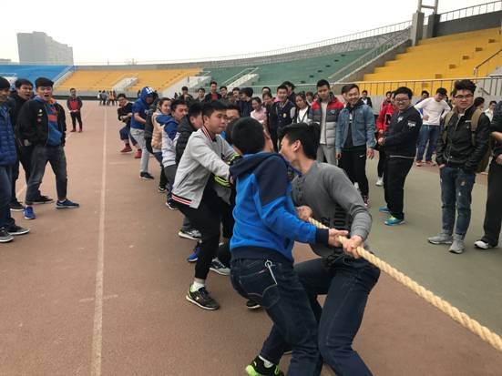 随着裁判员一声哨响,比赛开始了,各队队员齐心协力,一起呐喊,拔河的双方争夺异常激烈的,比赛场里热闹非凡,只见每位队员双手紧握长绳,团结一心,往一个方向使劲,拉拉队在旁边为参赛选手高喊“加油”助威,欢声笑语充满体育场。经过两天激烈的角逐,16010103班以绝对的优势取得了第一名,16010102班取得了第二名,16010208班取得了第三名。