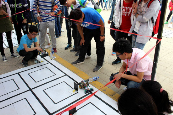 本次竞赛为参赛选手设计制作的光与识别智能竞赛车按照规定的九宫格赛道行驶,用时最短者获胜。途中撞到中途的标志物加罚0.5秒,冲出赛道或者未按照规定路线行驶视为未完成比赛,每队有2次机会。比赛现场紧张而有序,经过激烈的角逐,最终,电信学院14040101班李亮亮团队、14040515班张航团队设计的赛车快速而精确的走完赛程,获得第一名,调教合集