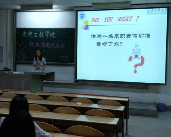 2011级110114班、110119班金阿敏和唐梦娜两位同学主讲。她们分别与签约西安光机所、舜宇光学的。全院200余名学生参加了此次交流会。