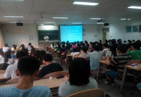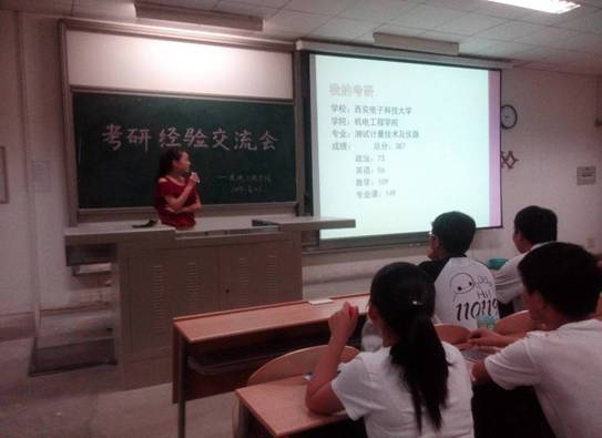 三名同学分别从学校的选择、数学、英语、政治、专业课及复试的准备几个方面为学弟学妹们讲解了他们在考研过程中总结的学习方法和心得体会。他们建议学弟学妹们考研时保持良好心态,目标明确,坚持不懈,相信自己。整个教室座无虚席,现场气氛活跃,同学们认真的听取了三位学长的考研经验,并就他们关心的问题进行了面对面的交流。三名学长对低年级考研学生的提出的问题一一做了详细的解答,解决了许多立志考研的低年级学生的困扰。