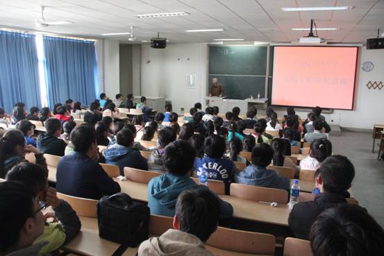 乔老师首先给同学们介绍了汉泽西教授,他曾任西安石油学院仪器系副主任,系主任,西安石油大学图书馆馆长等职,特别热爱学生。然后汉教授开始从“高考”和“大学”这两个关键词谈起,启发学生的思考。接下来,汉教授从如何念好大学课程、培养创新思维、关于阅读的思考、关注学科大方向、学会生活等方面入手,运用大量实例,以幽默诙谐的话语,与同学们分享了他几十来的人生感受,赢得同学们的阵阵掌声。