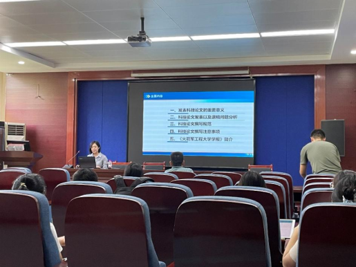 邀请到《火箭军工程大学学报》编辑部主任李淑娟主任,在工6-402报告厅,做“科技论文写作规范与投稿”学术讲座,旨在有效调动研究生参与学术交流的积极性,帮助学生掌握论文写作与投稿技巧,提升科研素养。本次讲座由副院长潘永强教授主持,学院百余名研究生及青年教师参加。