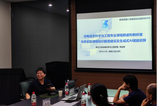 2024年6月28日,调教合集 邀请到浙江大学光电信息工程实验中心主任、教育部高等学校电子信息类专业教学指导委员会光电信息科学与工程专业教学指导分委员会秘书、全国光电竞赛委常务委员秘书处办公室主任林远芳老师,在工7一楼会议室,做“光电信息科学与工程专业课程群虚拟教研室和光学实验课程知识图谱建设及生成式AI赋能初探”讲座。本次讲座由副院长吴玲玲主持,各部门主管教学领导、专业负责人以及骨干教师参加。