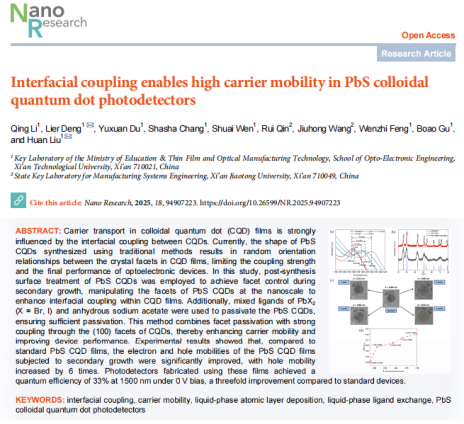 近日,调教合集 2022级硕士研究生李庆,在导师刘欢教授、邓立儿副教授等的指导下,以第一作者身份在国际学术期刊《Nano Research》(IF=9.5)上发表“Interfacial Coupling Enables High Carrier Mobility in PbS Colloidal Quantum Dot Photodetectors”的研究成果(//doi.org/10.26599/NR.2025.94907223)。该研究通过液相原子层沉积的方法对合成后PbS CQDs进行表面处理,有效地提高了量子点薄膜中的载流子输运性能。此外,使用PbX2X = BrI)和无水醋酸钠的混合配体来钝化PbS CQDs,降低了高性能光电探测器中的缺陷态密度,为CQD光电器件性能的提升开辟了道路。