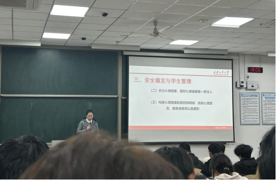 最后,陈慧英就冬季特殊季节,强调关注身体健康和心理健康的重要性。学生的身体健康和心理健康同等重要,希望同学们能够关注自身健康,合理规划学习和生活,养成良好的生活习惯。同时做好心理健康的第一责任人,构建完善的心理健康教育四级网络,班级心理委员和宿舍信息员要充分发挥作用,共同做好学生的安全稳定工作。