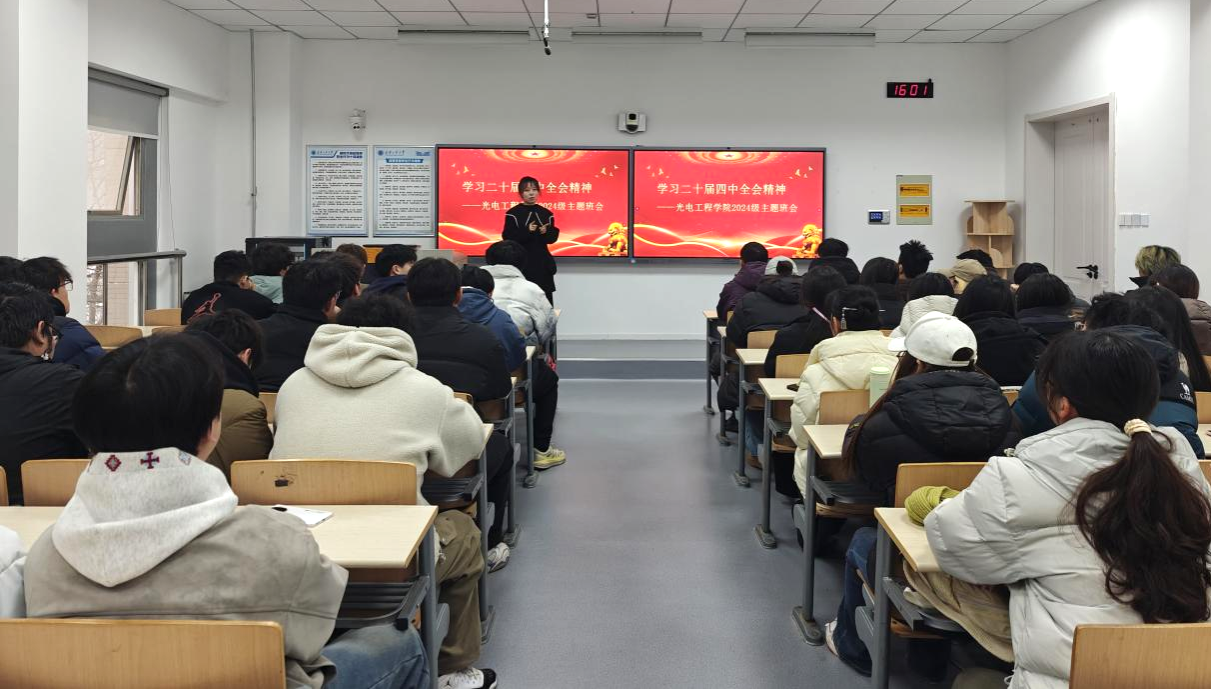 班会上,蒋紫洮系统阐述了党的二十届四中全会核心要义,重点解读了全会召开的时代背景、战略意义,并就“一体推进教育科技人才发展”“加快实现高水平科技自立自强”等重要部署进行了深入讲解。结合光电专业特色,蒋紫洮围绕全会对科技创新的战略要求,联系专业课程学习、科研实践入门、学科竞赛参与等具体场景,分析了青年学子在服务国家科技发展中的责任与机遇,鼓励同学们以实际行动贯彻落实全会精神。在互动交流环节,学生结合自身学习生活感悟踊跃发言,就专业学习与国家战略需求的衔接、如何平衡学业与实践锻炼等问题展开了热烈讨论。
